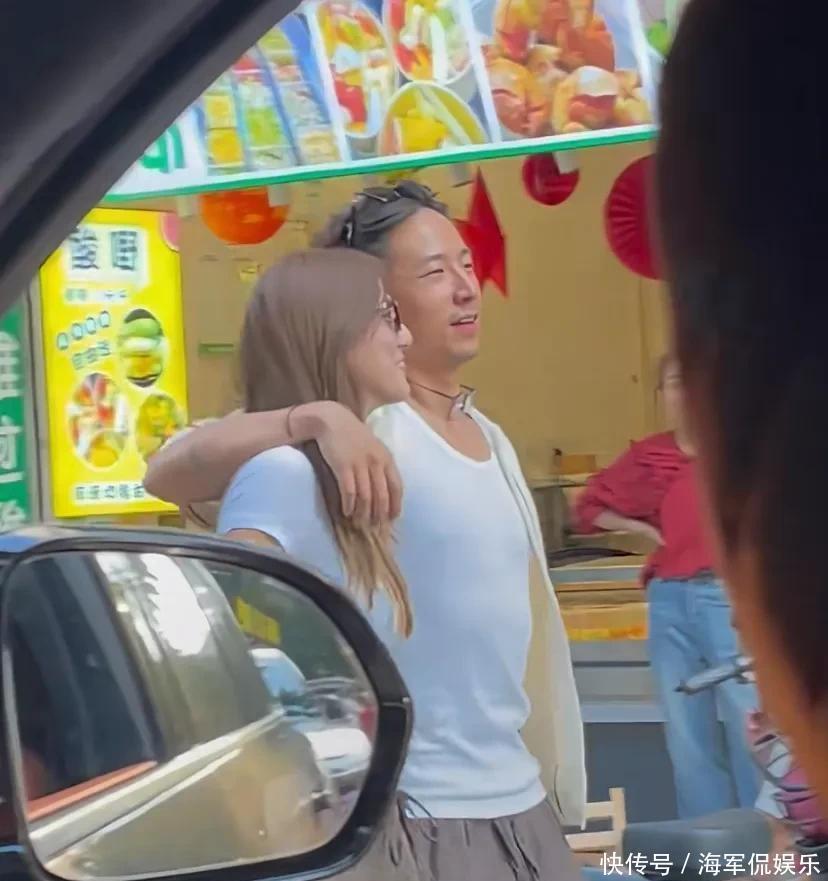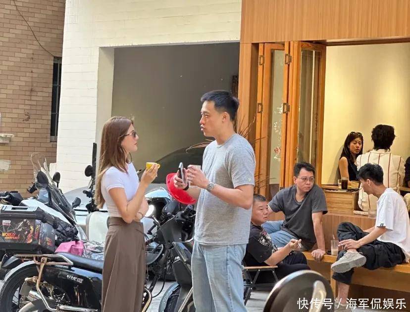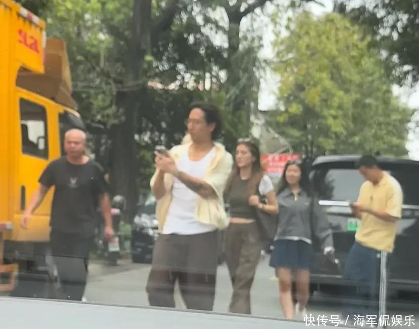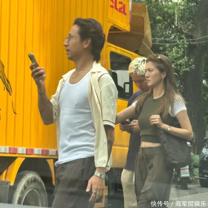和他们同行的还有其他友人,吴千语手捧着饮品,和一位男性友人站在店门口聊起天来,可能因为天气比较热的原因,吴千语就把身上的针织背心脱掉了,只穿着白色的修身上衣。虽然两人在一起有几年了,结婚也有一年了,可好像还是一直处在热恋期。