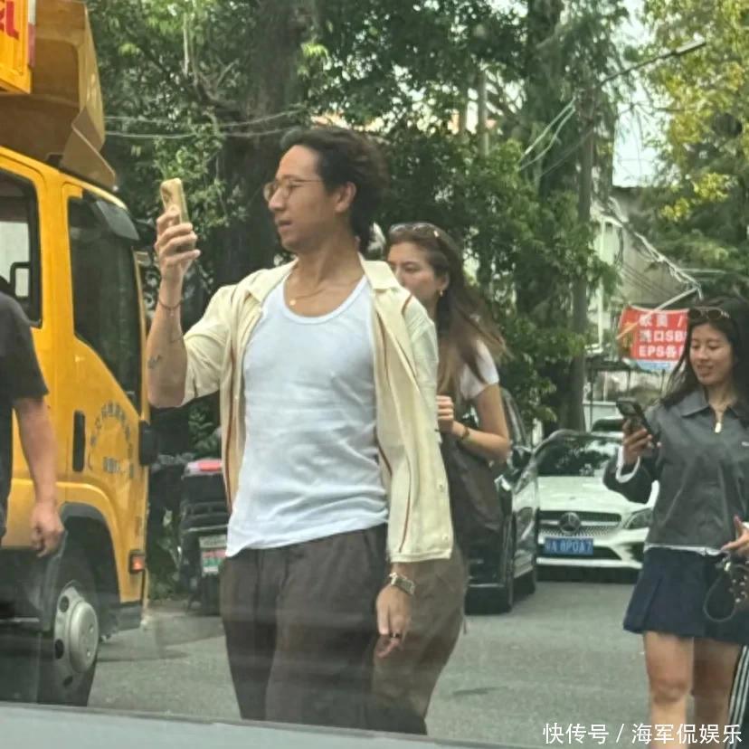 施伯雄穿着黄色衬衫搭配白背心,还凸点了,哈哈,他下半身穿了一条褐色的休闲裤,拿着手机边走边拍,松弛感满满。